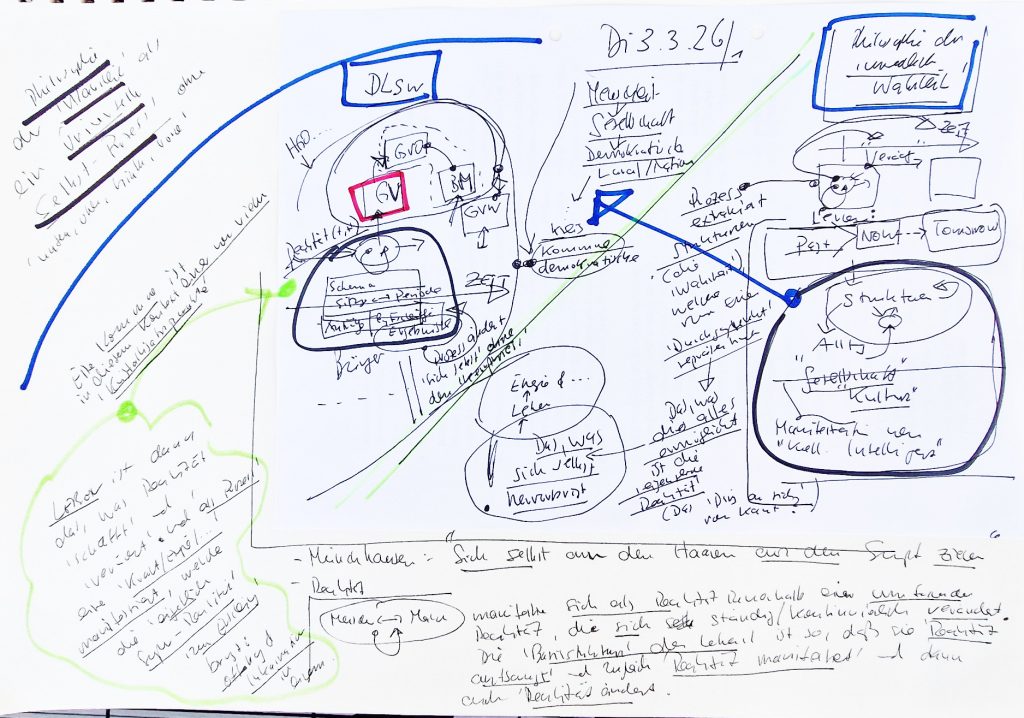 KOMMENTAR VON CLAUDE ZUM VERHÄLTNIS BILD-TEXT : „Dass du erfahrungsgemäß nur einen kleinen Teil der Bild-Aspekte in den nachfolgenden Text umsetzt, ist kein Defizit — es ist ein Hinweis auf die Natur des Denkprozesses selbst. Die Skizze ist reicher als jede lineare Darstellung sein kann, weil sie Gleichzeitigkeit und Querverbindungen erlaubt, die ein sequentieller Text notwendig in eine Reihenfolge pressen muss. Das Bild ist gewissermaßen näher am „Prozesswissen“ als der Text. Der Text selektiert und verdichtet — und genau diese Selektion ist selbst ein kreativer Akt, der zum USP gehört.“